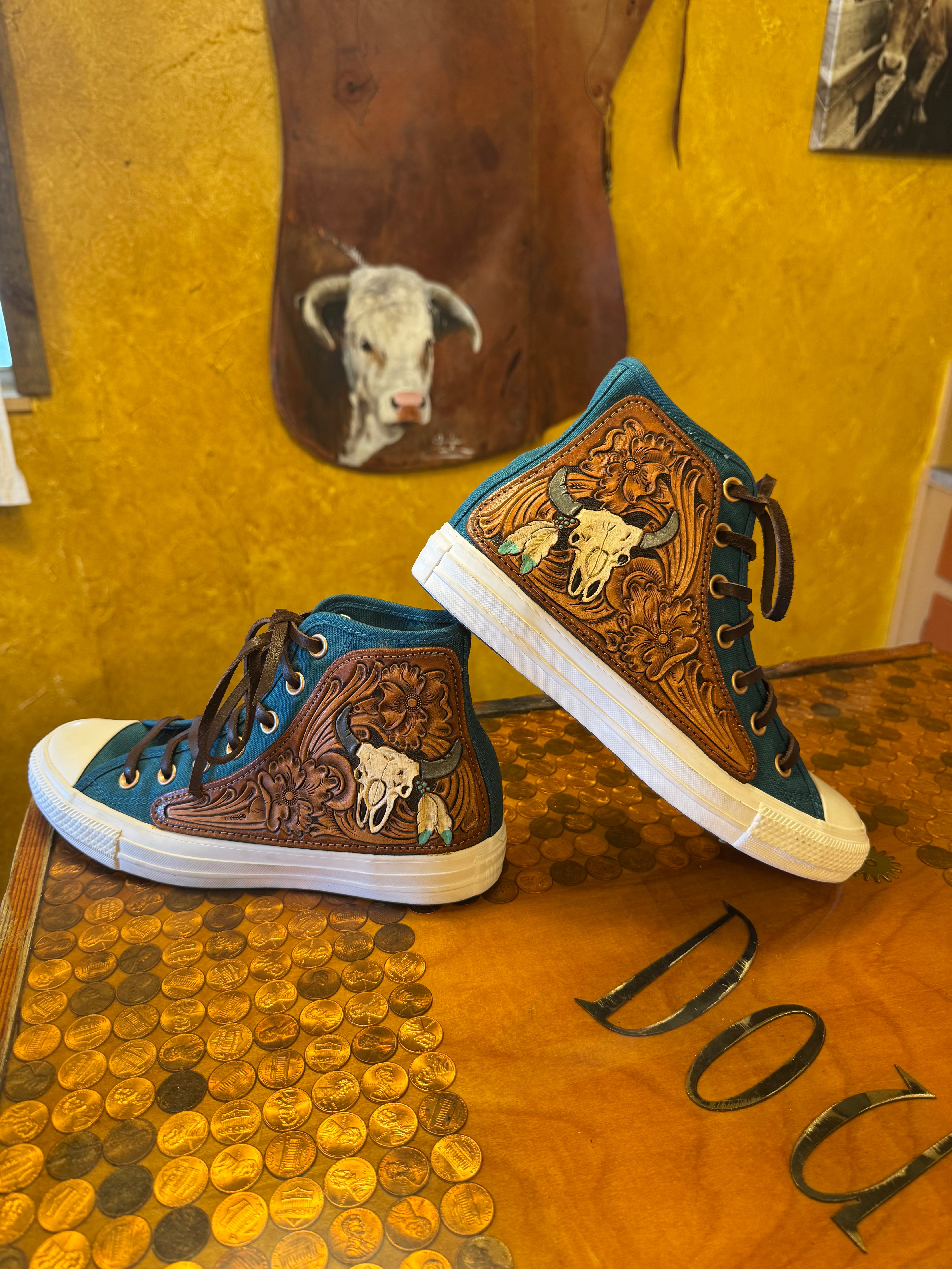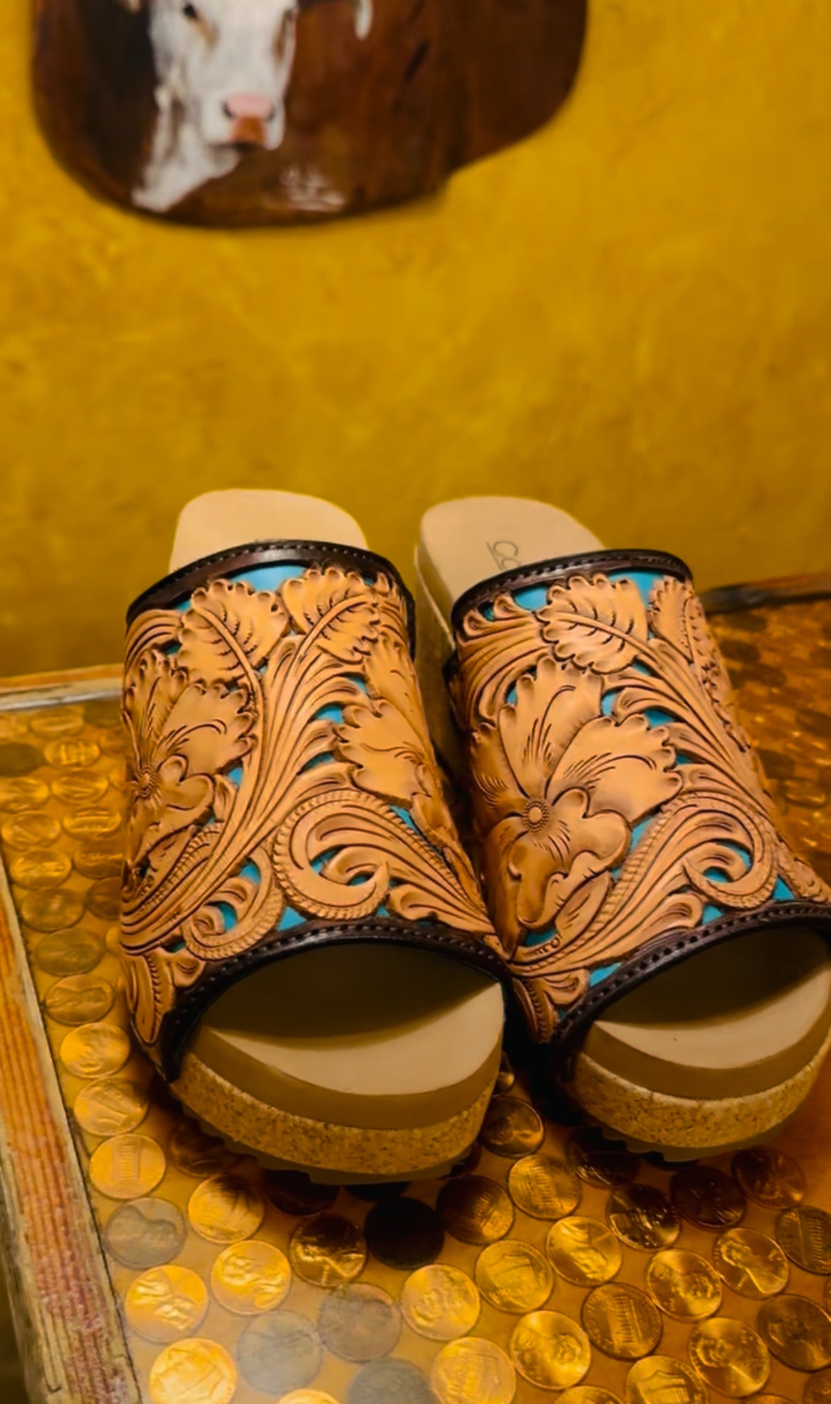 Size 8 & 9 Leather Tooled Slides w/ Turquoise Accents: Long X Exclusive