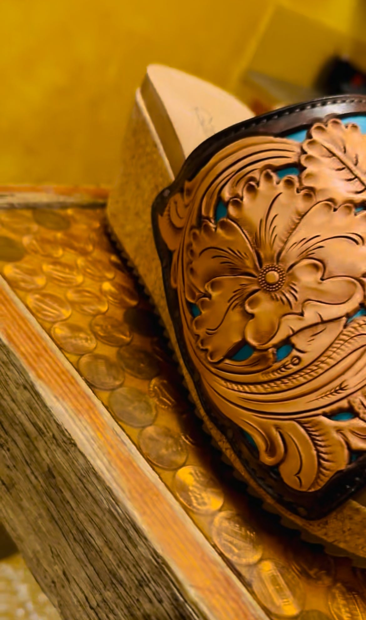 Upgrade your summer wardrobe with our Women's Leather Tooled Slides, beautifully accented with vibrant turquoise details. Handcrafted with premium leather, these slides feature intricate tooling that adds a touch of...